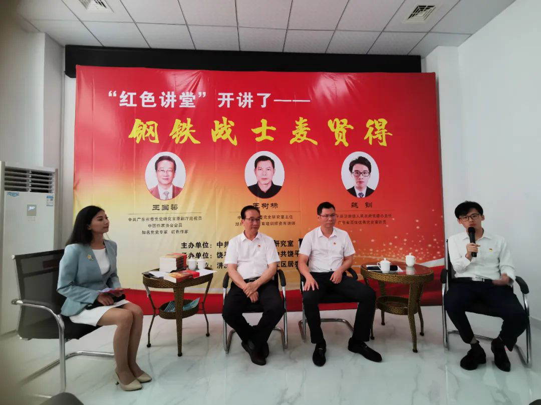 活动邀请了广东省委党史研究室原副厅巡视员、知名的红色作家、党史专家王国梁,饶平县委党史研究室主任、潮州市党员教育培训师资库讲师、饶平县委理论宣讲团成员王树标,饶平县汫洲镇人民政府党建办主任、广东省百佳优秀党史宣讲员、潮州青年讲师团成员、潮州市党员教育培训师资库第一批入库讲师魏钏三位党史专家和嘉宾,以沙龙的形式,围绕“红色讲堂开讲了——钢铁战士麦贤得”主题开展研讨,通过讲述麦贤得英雄的成长故事、英雄事迹以及其妻子李玉枝的高尚情操和模范事迹,深刻剖析麦贤得的“硬骨头”精神中蕴含着的廉洁基因,探讨传承麦贤得的“硬骨头”精神对推动潮州文化、经济社会高质量发展的意义,旨在用革命文化淬炼公而忘私、甘于奉献的高尚品格,激励广大党员干部廉以律己、无私奉献。