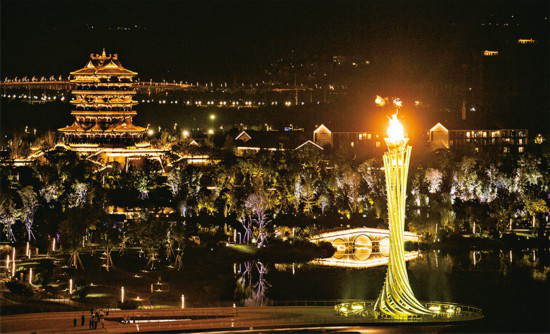 2023年7月28日晚,第31届世界大学生夏季运动会开幕式在成都东安湖体育公园主体育场举行。这是成都大运会主火炬。 新华社记者 曹祎铭/摄