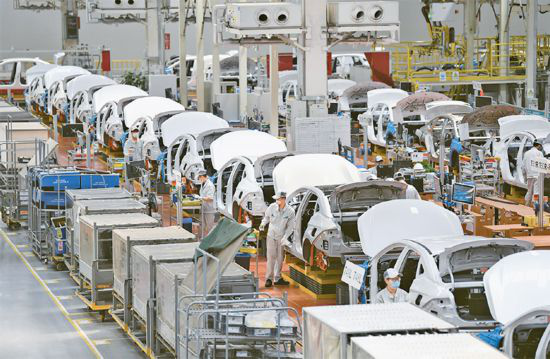 2023年4月12日,习近平总书记来到广汽埃安新能源汽车股份有限公司考察。他走进企业展厅、总装车间、电池生产车间等,了解企业突破关键核心技术和推动制造业高端化、智能化、绿色化等进展情况。图为广汽埃安新能源汽车股份有限公司总装生产线。新华社记者 邓华/摄